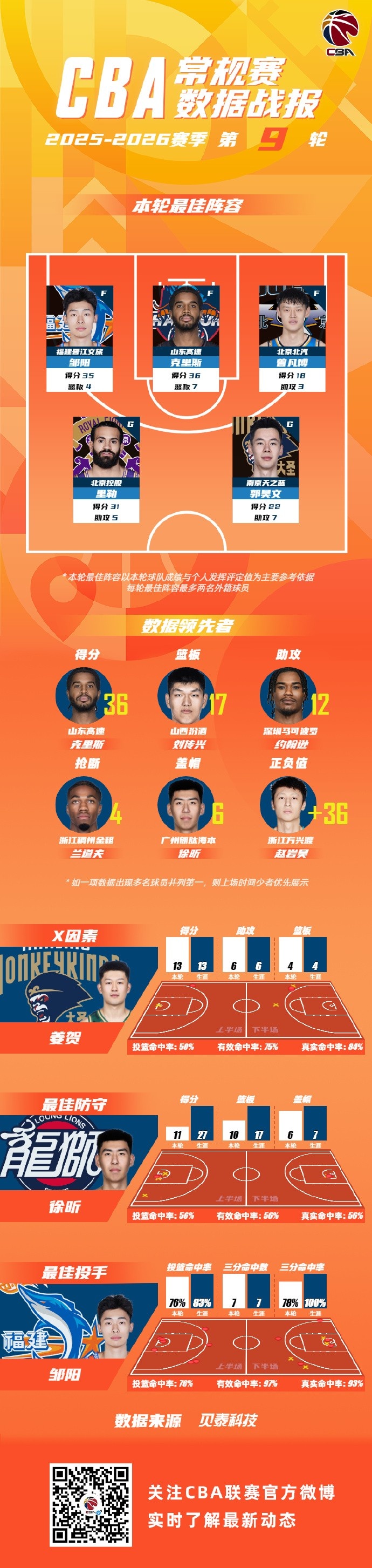 2025-2026賽季CBA聯(lián)賽常規(guī)賽第9輪結(jié)束較量,來自福建潯興SBS男籃的鄒陽,山東高速籃球俱樂部的克里斯,北京首鋼籃球俱樂部的曾凡博 ,北京控股籃球俱樂部的里勒和南京同曦籃球俱樂部的郭昊文入選CBA聯(lián)賽常規(guī)賽第9輪最佳陣容!