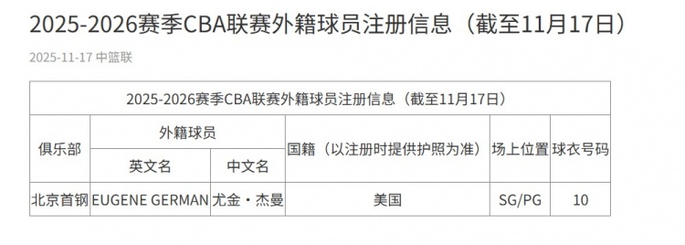 11月17日訊 CBA官方更新《2025-2026賽季CBA聯(lián)賽外籍球員注冊信息》。其中,北京男籃為杰曼完成注冊,這也是CBA新賽季第一個(gè)注冊的外援。杰曼上賽季為北京出戰(zhàn)了46場常規(guī)賽,場均得到17.5分4.4籃板6.8助攻,季后賽出場13次,場均貢獻(xiàn)20.8分4.5籃板8.1助攻。