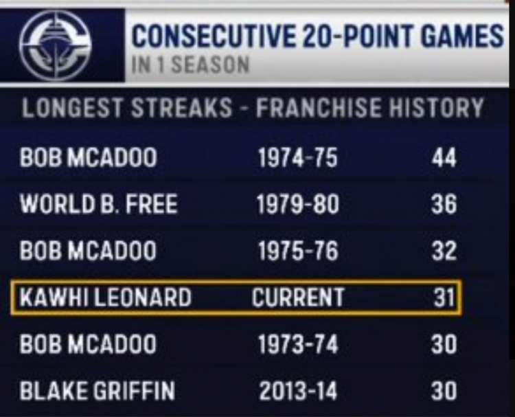 倫納德連續(xù)32場比賽20+,并列快船隊(duì)史第三長。