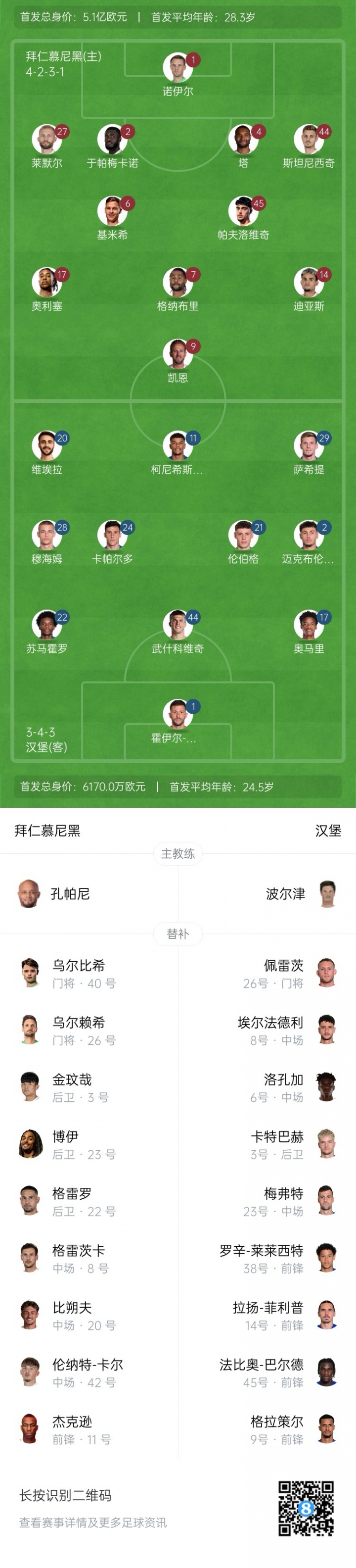 拜仁首發(fā):1-諾伊爾、2-于帕梅卡諾、4-塔、44-斯坦尼西奇、45-帕夫洛維奇、6-基米希、7-格納布里、27-萊默爾、14-迪亞斯、17-奧利塞、9-凱恩