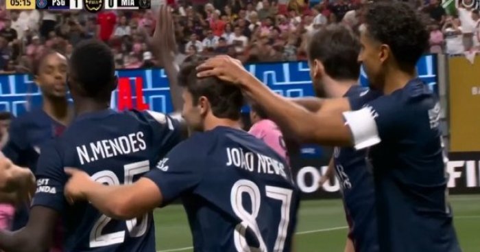 巴黎領先!若奧-內維斯破門,維蒂尼亞助攻!第6分鐘,維蒂尼亞主罰任意球開出到后點,若奧-內維斯頭球沖頂破門,巴黎圣日耳曼1-0邁阿密國際!↓
