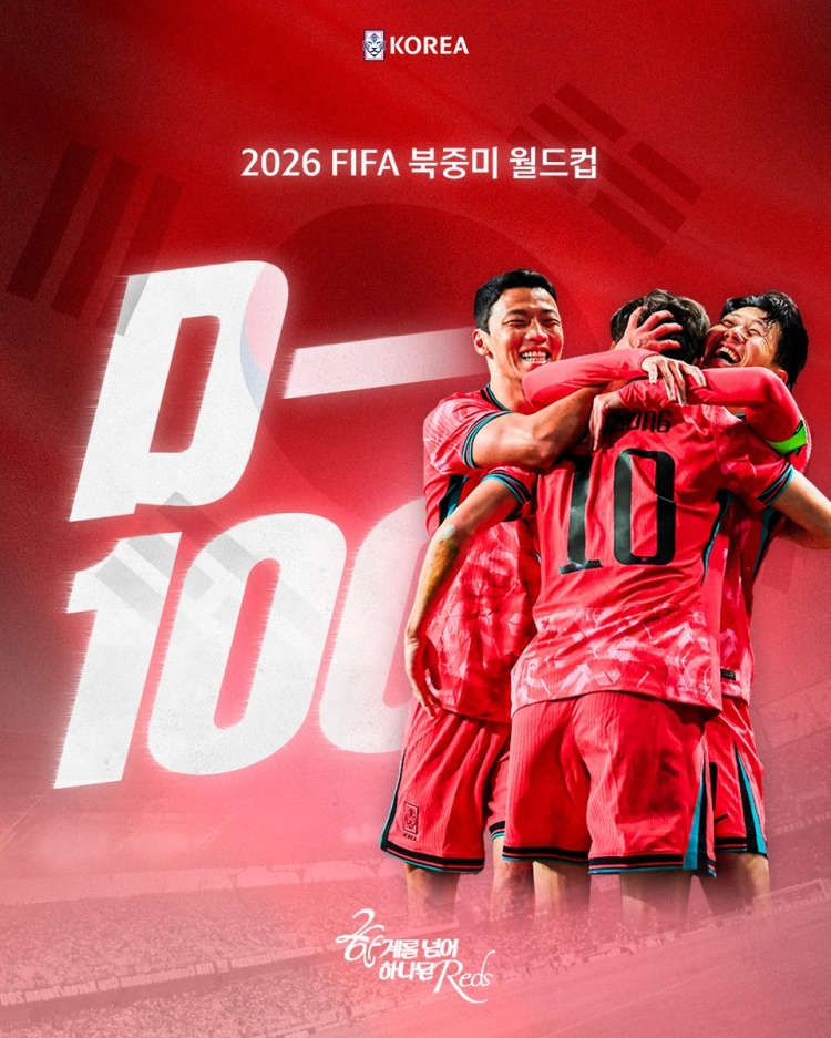 韓國(guó)足協(xié)官方社媒曬出倒計(jì)時(shí)海報(bào),配文:“2026年世界杯倒計(jì)時(shí)100天。100天后韓國(guó)足球?qū)⒃俣赛c(diǎn)燃全球激情,超越極限,團(tuán)結(jié)一心。”
