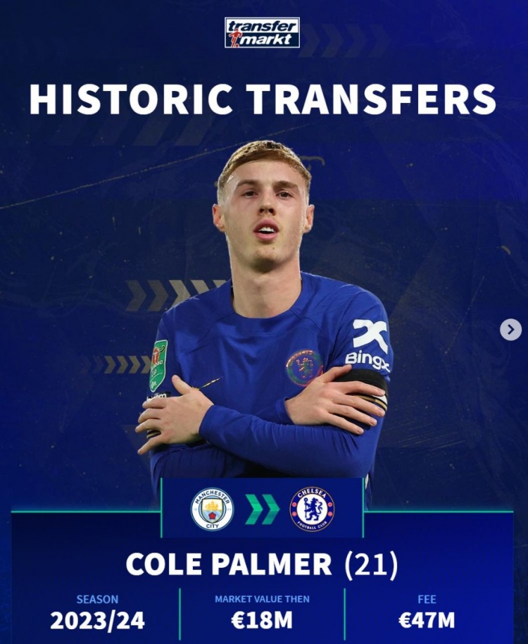 帕爾默(21歲):曼城→切爾西,23-24賽季,身價(jià)1800萬,轉(zhuǎn)會(huì)費(fèi)4700萬