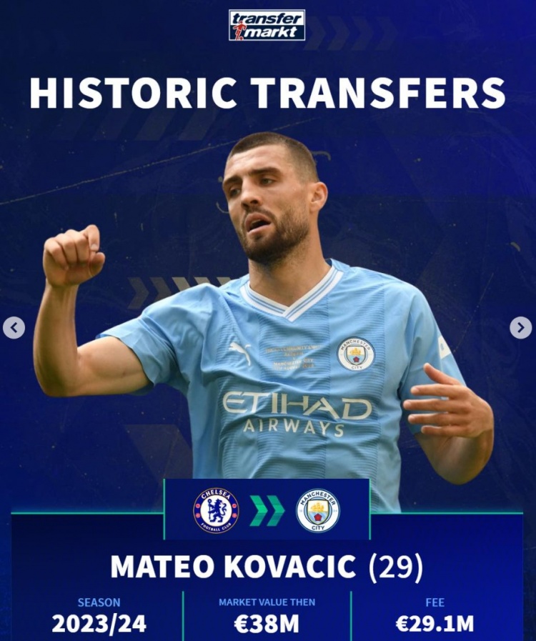 科瓦西奇(29歲):切爾西→曼城,23-24賽季,身價(jià)3800萬,轉(zhuǎn)會(huì)費(fèi)2910萬