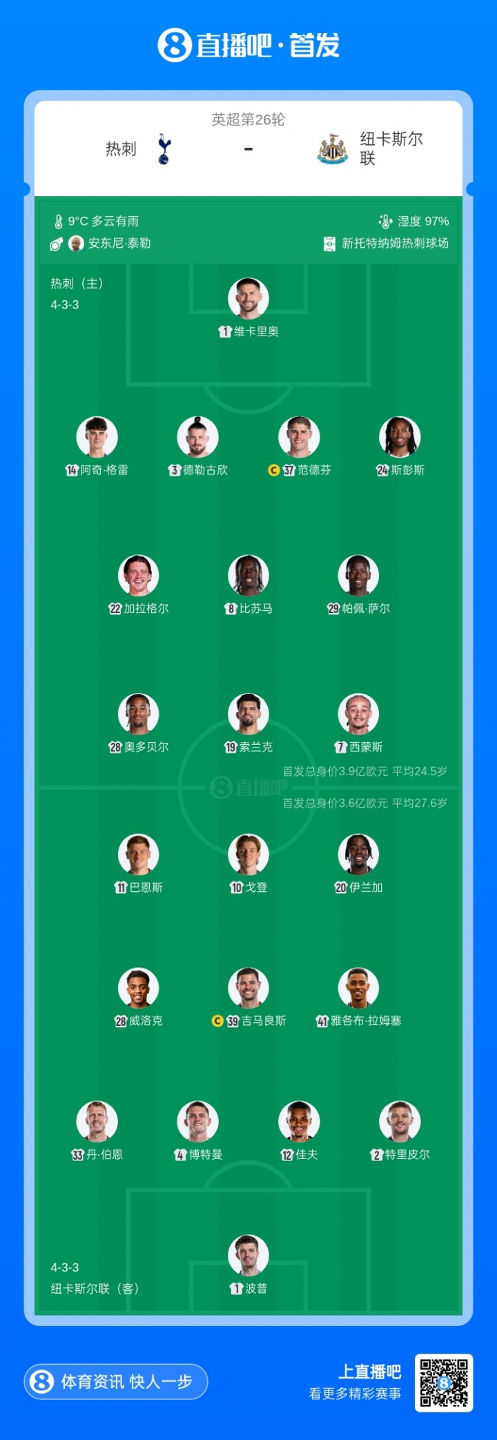 2月11日訊 北京時(shí)間2月11日3:30,英超第26輪,熱刺vs紐卡。賽前雙方公布了本場(chǎng)比賽的首發(fā)名單。