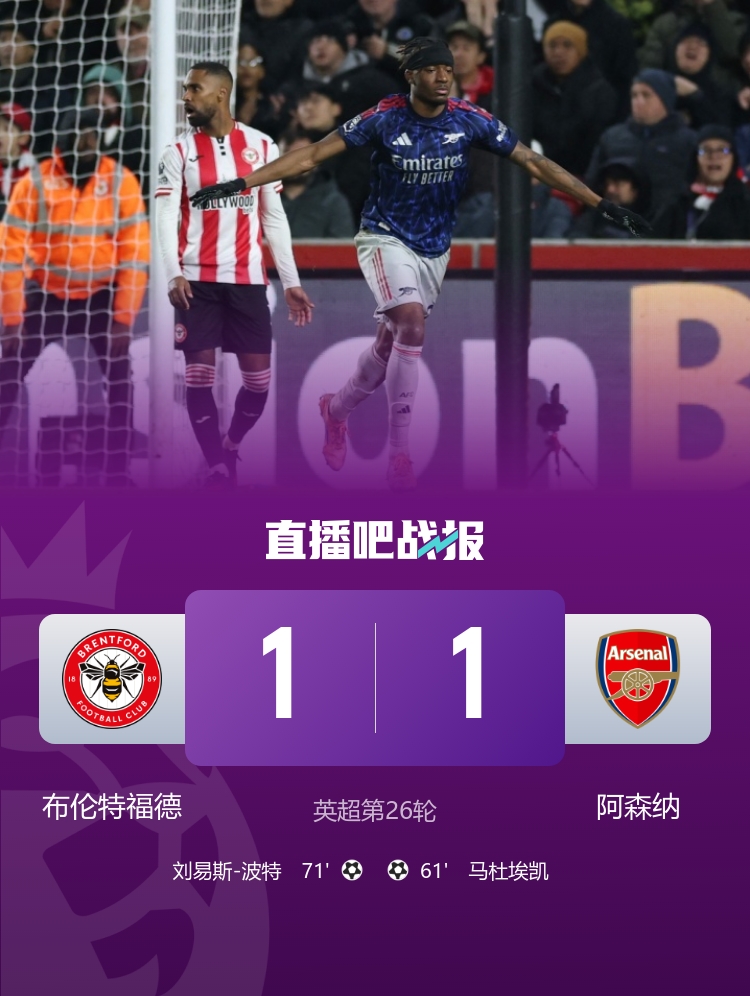 四分領(lǐng)跑!阿森納1-1布倫特福德 馬杜埃凱破門拉亞神撲馬丁失單刀