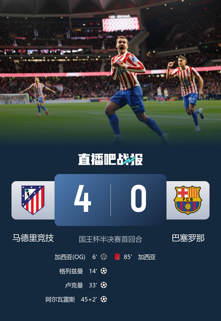霍安失誤送禮,阿爾瓦雷斯、盧克曼互相傳射,庫巴西進球被吹引爭議,埃里克·加西亞染紅;國王杯半決賽次回合3月4日移師諾坎普。
