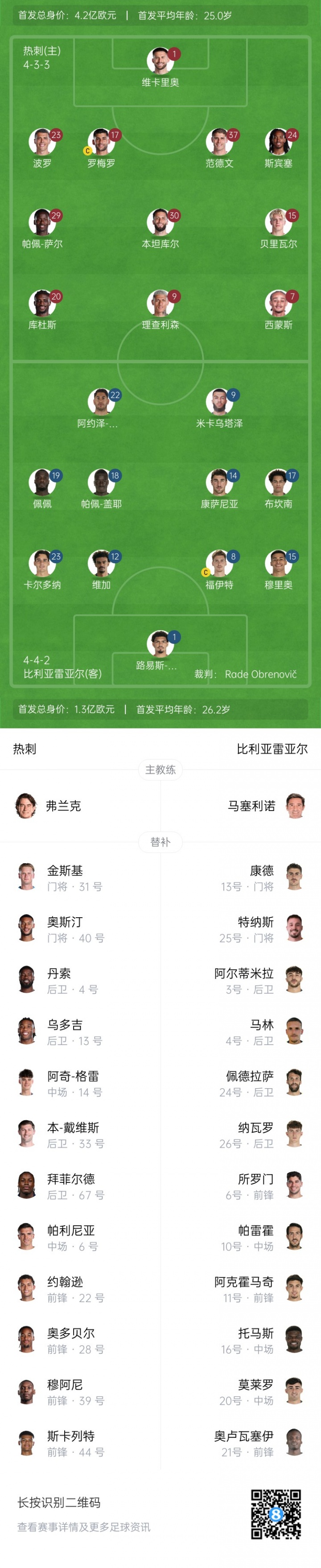 9月17日訊 今天凌晨3:00,歐冠首輪,熱刺vs比利亞雷亞爾。賽前雙方公布了首發(fā)名單。