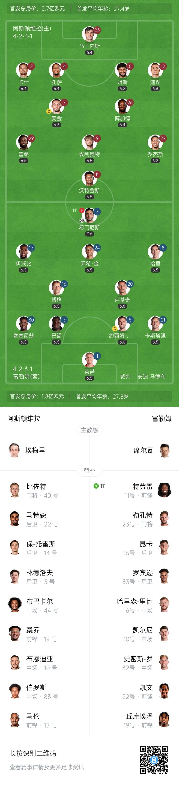 9月28日訊 北京時間9月28日晚上21:00,英超第6輪,阿斯頓維拉坐鎮(zhèn)維拉公園球場迎戰(zhàn)富勒姆。上半場,希門尼斯3分鐘破門,明斯傷退,馬丁內斯化解單刀,沃特金斯挑射扳平。半場戰(zhàn)罷,阿斯頓維拉1-1富勒姆。