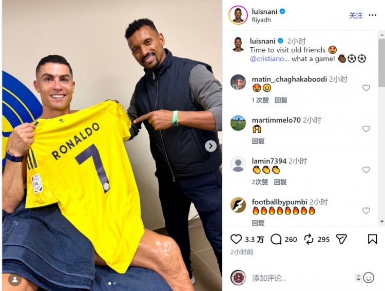 C羅的老隊(duì)友納尼現(xiàn)場(chǎng)觀看了這場(chǎng)比賽,并獲贈(zèng)C羅球衣,他在社交媒體上曬出與C羅的合照,配文:“是時(shí)候拜訪老朋友了,多么精彩的比賽!”