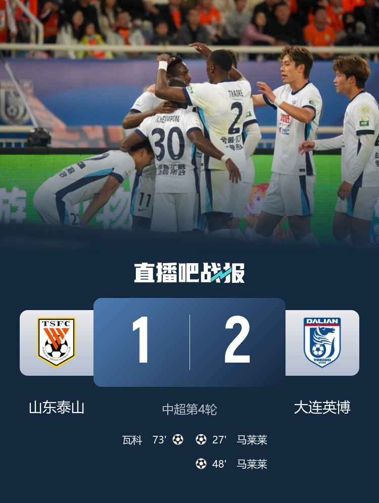4月4日訊 北京時(shí)間19:00,中超第4輪山東泰山vs大連英博,比賽在濟(jì)南奧體中心體育場打響!上半場,毛偉杰染黃,澤卡頭球中柱;斯坦丘兜射造險(xiǎn),王大雷神撲;毛偉杰斷球穿插,馬萊萊補(bǔ)射破門!下半場,斯坦丘助攻馬萊萊完成雙響;瓦科外腳背破門。最終,山東泰山主場1-2不敵大連英博,遭遇中超兩連?。?輪過后暫積0分;大連英博先賽暫升第4。