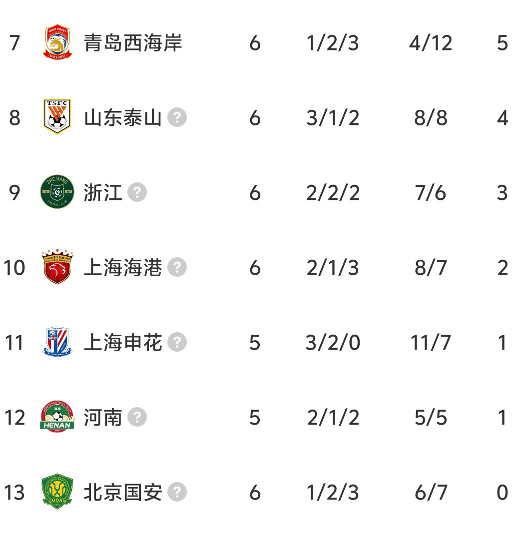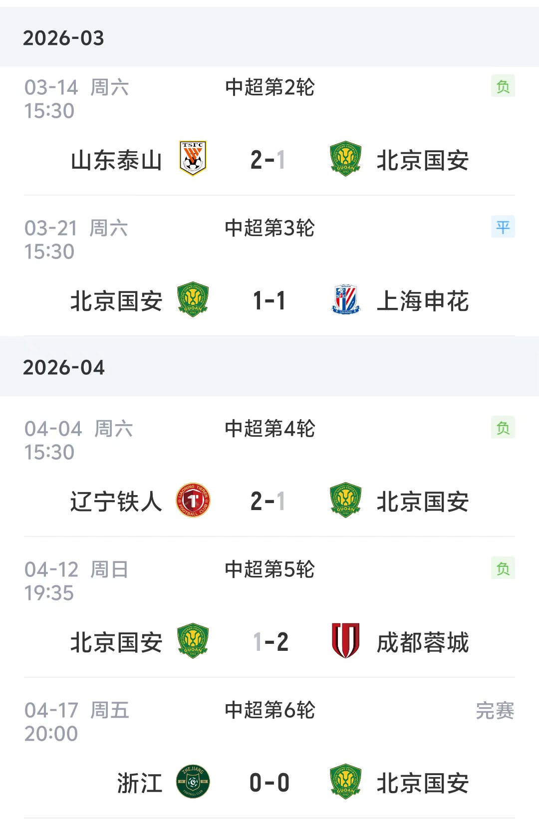 第6輪,北京國安客場(chǎng)0-0戰(zhàn)平浙江,聯(lián)賽五輪不勝,積分由-1轉(zhuǎn)為0分。